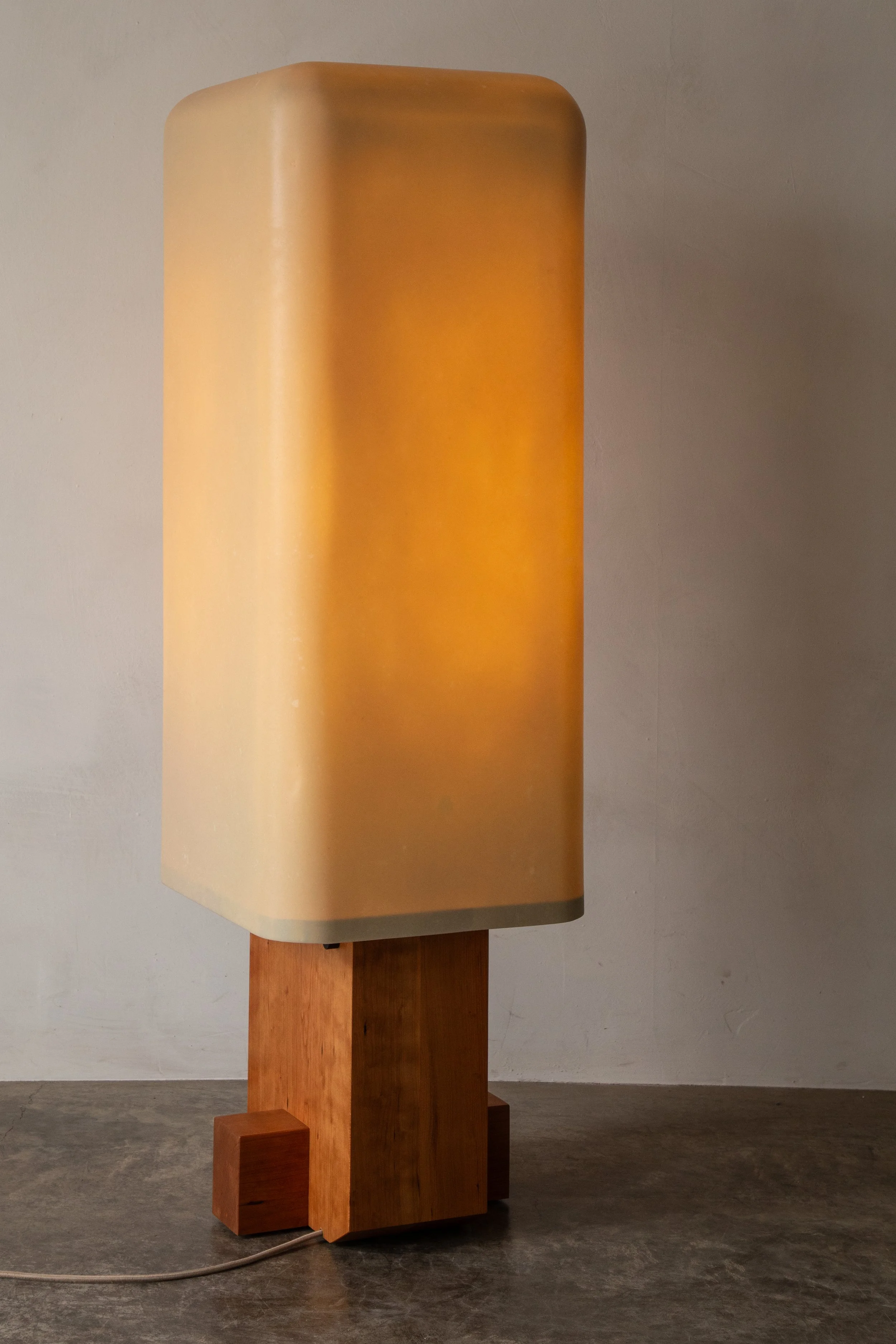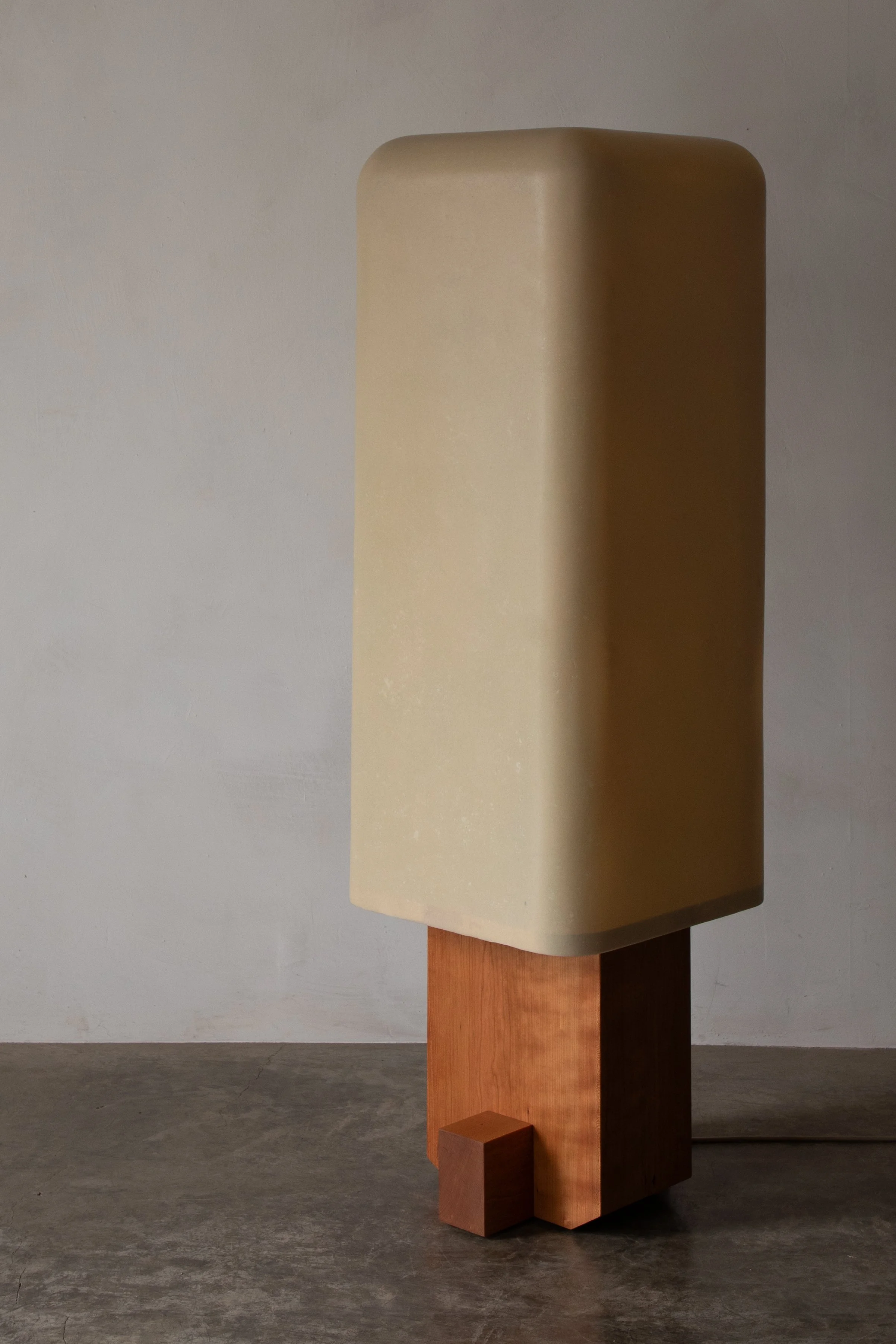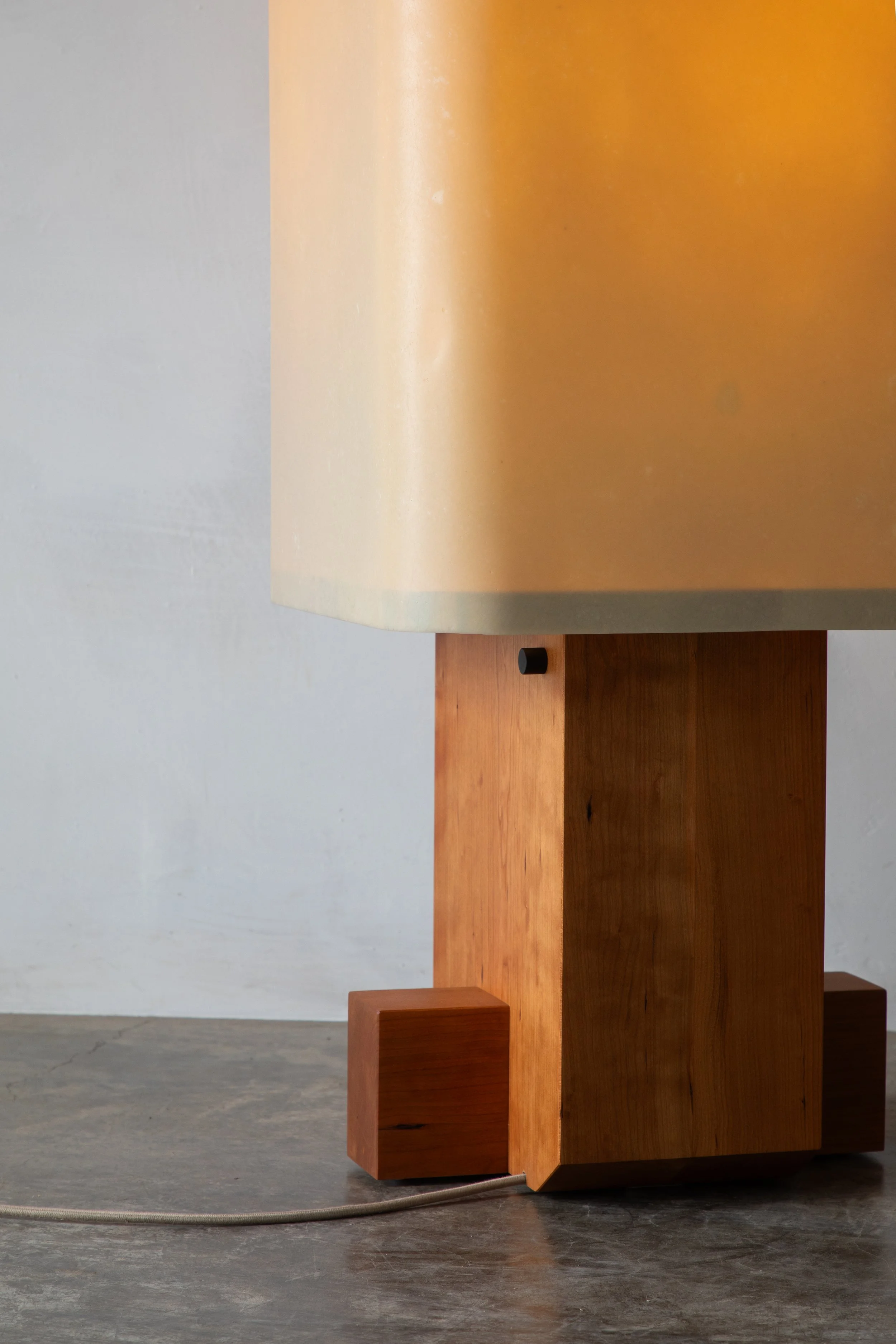 Bill features a built-up hardwood base, a large hand laid fiberglass shade and custom steel armature. Handmade in the Hudson Valley, New York.