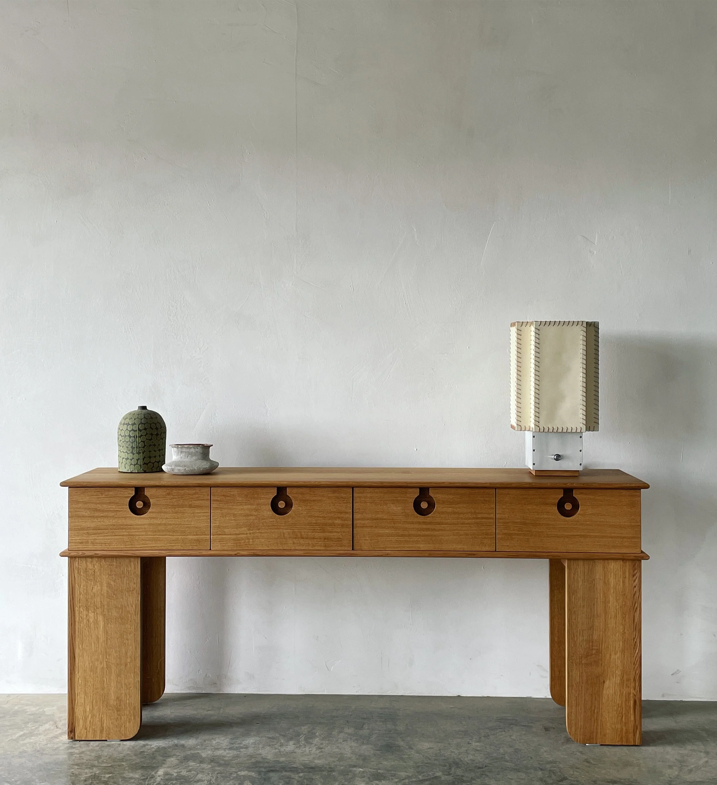 Torre series of lamps reference Brutalist architecture forms, Casa Luis Barragán, using refined wood and metal working techniques.